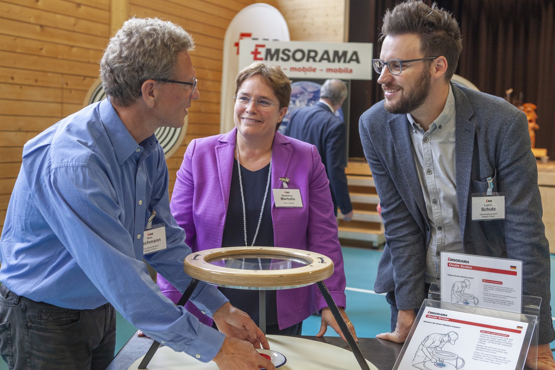 Die Vertreter des Gemeindevorstands, des Gewerbes und der Schulen liessen sich anschliessenden zusammen mit den Schülern gleich selber spielerisch auf die praktischen Experimente ein. Die Eindrücke der Besucher bestätigen die positiven Erwartungen von EMS-Chefin Magdalena Martullo. Das EMSORAMA Mobil wurde am Freitag, 6. September 2019, von verschiedenen Schulklassen der ganzen Region Albula besucht. Am Samstag, 7. September 2019, 09.00 bis 16.00 Uhr steht die Ausstellung für die Öffentlichkeit offen. Danach fährt das EMSORAMA Mobil weiter nach Val Müstair (13./14. September 2019) und nach Zernez (20./21. September 2019). Selbstverständlich bleibt das stationäre EMSORAMA in Domat/Ems weiterhin für Besucher offen.