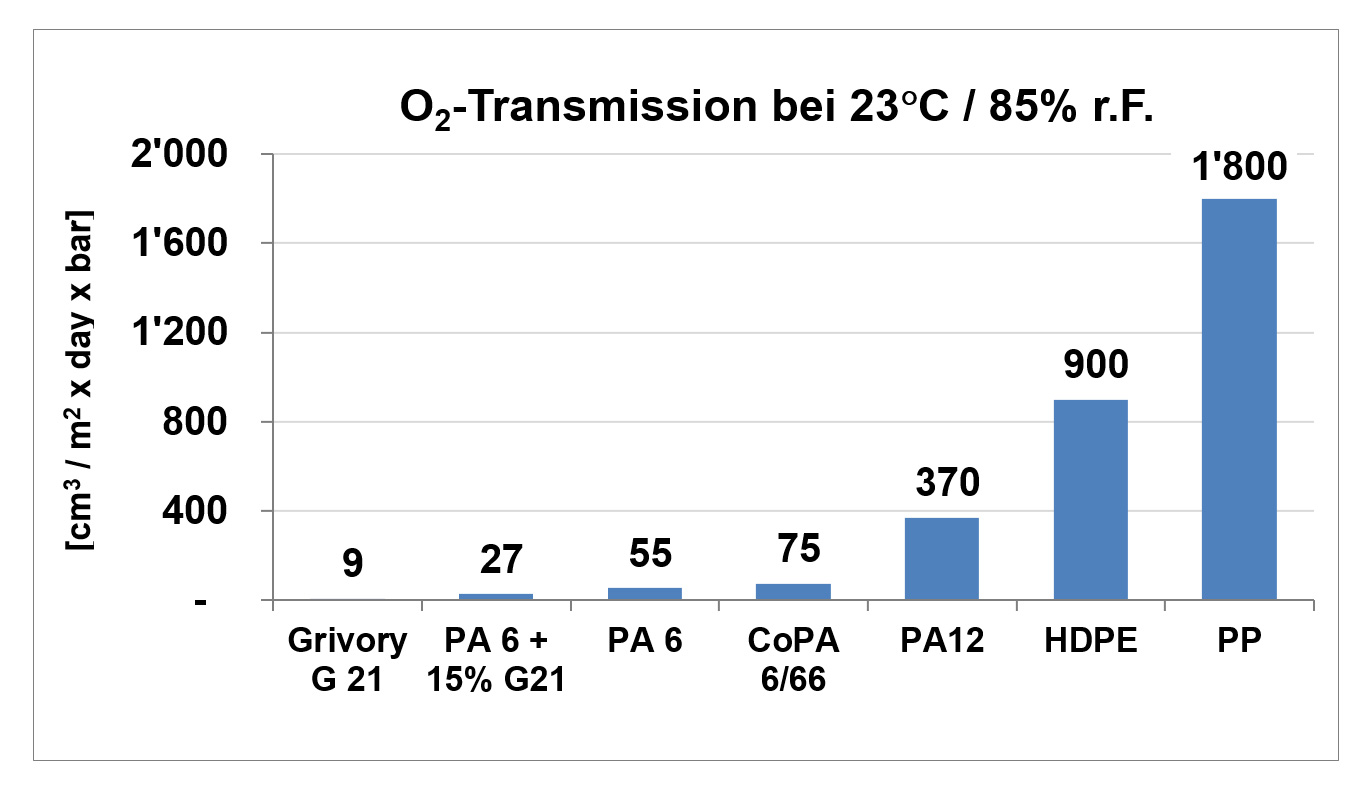Grivory G21 ist ein hochviskoses, amorphes Copolymer mit hoher Sauerstoff-Barriere, dass die Anforderungen für den direkten Lebensmittelkontakt in der EU, den USA und Asien erfüllt. Es wird sowohl für Mono- als auch für Mehrschichtfolien eingesetzt. EMS-GRIVORY ist weltweit führend mit diesem Spezialpolyamid.