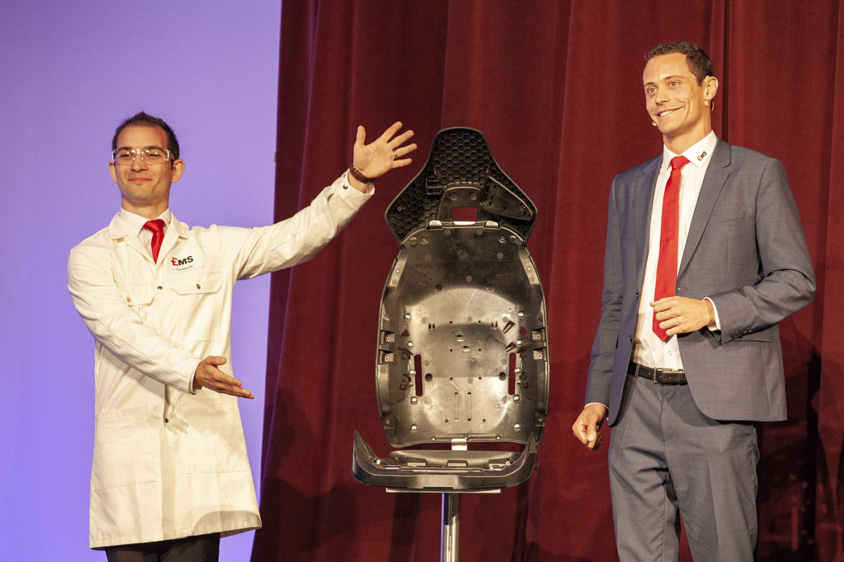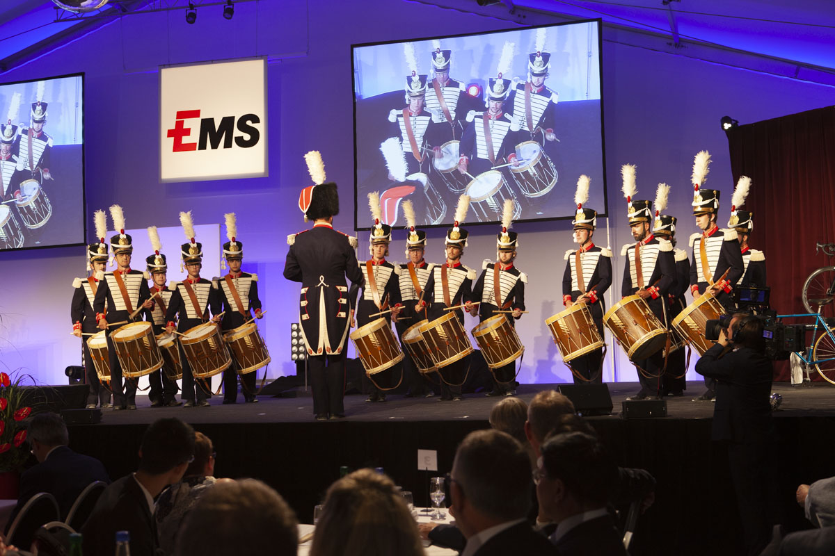 Ein weiterer Höhepunkt waren die von EMS-Lernenden und -Mitarbeitern originell präsentierten Innovationen aus EMS-Spezialkunststoffen unter dem Motto "EMS – konstant neu!": Die bahnbrechende Autositz-Schale aus EMS-Material reduziert das Sitzgewicht um 50% und die Herstellkosten um 20%. EMS-Mitarbeiterinnen zeigten derweil exklusiv designte und hochbelastbare Kosmetikverpackungen aus EMS-Kunststoffen. Und dank ultraleichtem aber hochfestem EMS-Spezialkunststoff werden anspruchsvolle Fahrradkomponenten wie Bremsen, Gangschaltungen und interaktive Klick-Pedale international mit Leichtigkeit entwickelt. Den Schlusspunkt setzte der Tambourenverein Domat/Ems in historischen Uniformen unter der Leitung von Andri Seglias.