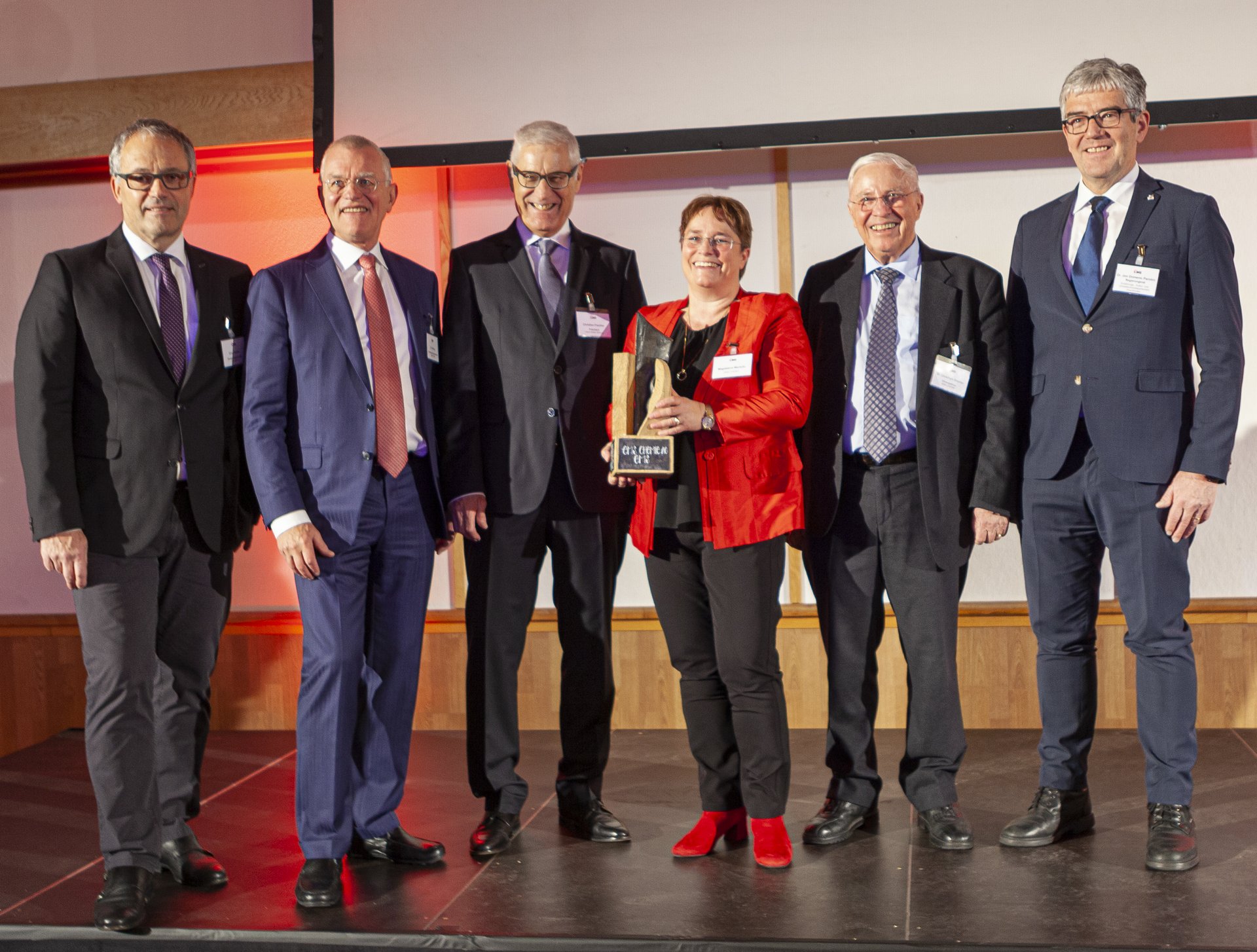 Mit dem "Nationalen Bildungspreis" zeichnen die Hans Huber Stiftung und die Stiftung FH SCHWEIZ jährlich ein national tätiges Unternehmen aus, das eine vorbildliche Berufsbildung betreibt und sich langjährig, nachhaltig sowie mit grosser Breitenwirkung für die Förderung der dualen Grundbildung einsetzt. Bei EMS-CHEMIE sei der Name Programm – sei sie nämlich nicht nur ein «emsiger» Hersteller von innovativen Spezialkunststoffen, sondern ebenso «emsig» in der Förderung und gezielten Ausbildung von bestausgebildeten Fachkräften von morgen, so Christian Fiechter im Rahmen seiner Würdigung. «Es gibt wenig Unternehmen, wo die Lernenden so gute Perspektiven und Förderung erhalten wie hier», betonte Fiechter bei der Überreichung des Nationalen Bildungspreises an die EMS-Chefin Magdalena Martullo.