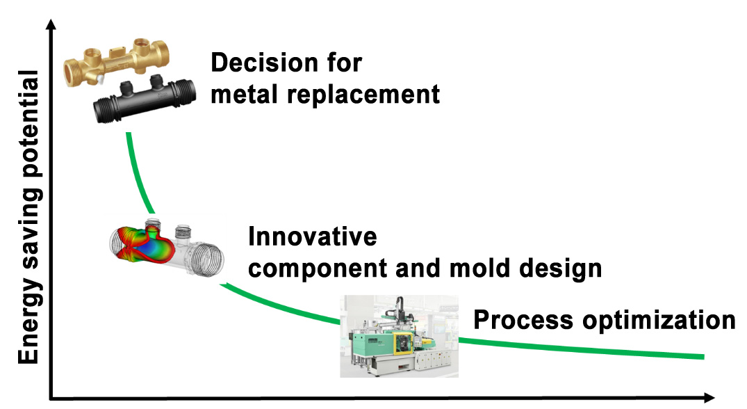 EMS provides active customer support for reduction of their carbon footprint. With advanced moldflow analyses, replacement of metal with lighter-weight and more sustainable materials as well as process optimization, EMS helps reduce energy consumption and minimize environmental impact. (Fig. 4: Energy savings for customers from support by EMS). These measures enable customers to make their products more environmentally friendly and achieve their sustainability goals.