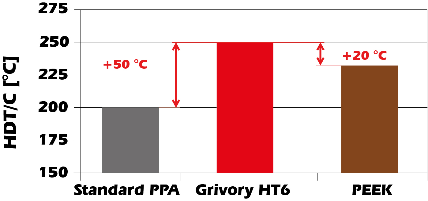 In 1994, EMS-GRIVORY launched the market introduction of the high-temperature material Grivory HT. With this tried and tested product, EMS-GRIVORY has become market leader in Europe and offers the widest PPA product portfolio worldwide. With Grivory HT6, EMS-GRIVORY has launched a new Grivory HT-product line with significantly increased temperature performance onto the market.