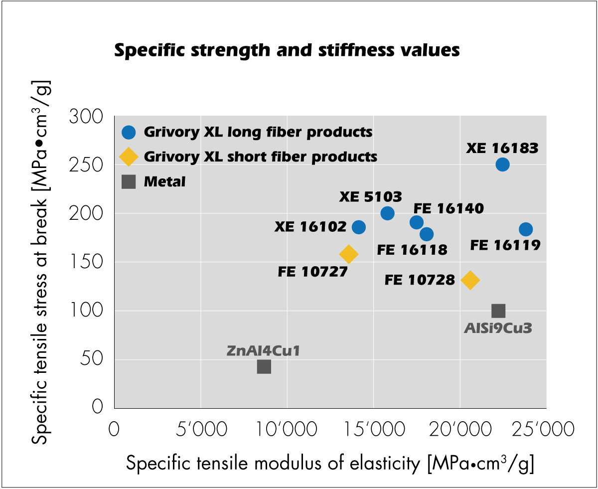 All these properties are offered by materials which have a very low density; the increased stiffness values do not result in an increase of mass of the component. In addition, the values for specific strength and stiffness are much higher than those of metals like zinc die cast. This makes the materials extremely attractive for light-weight construction.