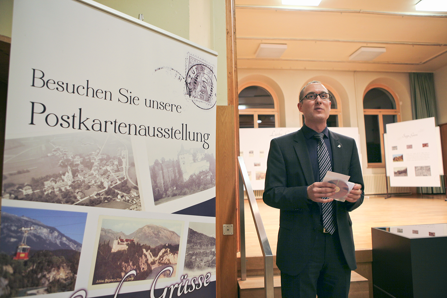 In seiner kurzen Ansprache bedankte sich Herbert Bonorand, Rhäzünser Gemeindepräsident, für das aussergewöhnliche Geschenk. Auf einer 12 Meter langen Wand zeigt die Ausstellung rund 90 historische Postkarten von Rhäzüns und seinem Schloss aus verschiedensten Perspektiven: Rhäzüns mit der Albulalinie, der Luftseilbahn Rhäzüns / Feldis, dem Rheinverlauf, der Kirche Sogn Gieri sowie Schloss und Dorf.